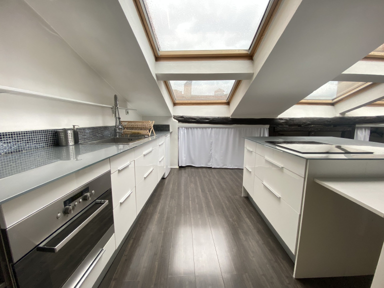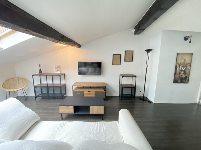 Toulouse place Dupuy (37 rue des Freres Lion), idéalement situé, proche des commerces et des transports. A louer un appartement T2 meublé de 42.10 m² (70 m² de surface au sol) situé au 3eme et dernier étage d'une petite copropriété. L'appartement est composé d'une pièce à vivre spacieuse avec une cuisine ouverte, offrant ainsi un espace de vie unique et lumineux grâce à ses 6 velux, une chambre, une salle de bain et un W.C. indépendant. L'appartement est climatisé et dispose de nombreux rangements.