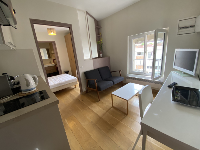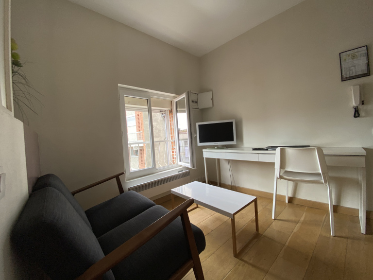 Toulouse, idéalement situé dans l'hyper centre à deux pas de la place Saint Georges au dernier étage sans ascenseur d'une petite copropriété, appartement T1 meublé et équipé (dont machine à laver) de 18.20 m² qui se compose d'un espace vie avec cuisine ouverte, un coin nuit séparé et une salle d'eau. Appartement récement rénové.