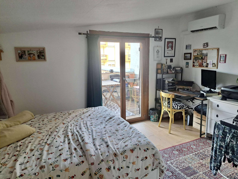 Le premier niveau offre une pièce de vie lumineuse avec cuisine ouverte et une petite chambre. À l’étage, vous apprécierez un espace dégagement modulable en coin bureau, une salle d’eau, et une grande chambre mansardée ouvrant sur une loggia de 8,68 m² avec vue dégagée.